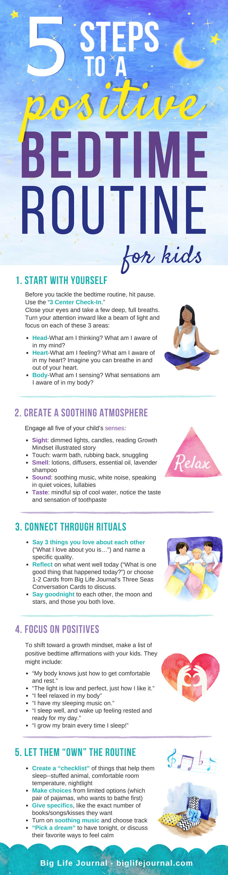 Creating a positive bedtime routine for your kids starts with creating a relaxing pre-bedtime environment. This can be done by dimming the lights, turning off TVs and other electronics, playing calming music, and even using essential oils. It’s important to create a calming atmosphere so your child can wind down and relax before bed. Additionally, having a bedtime routine that’s consistent and predictable can help your child relax and eventually fall asleep.